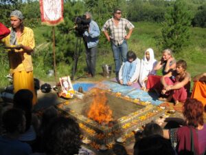 В 1991 году, когда неофициально был основан ашрам «Омкар Шива Дхам». По просьбе индийского гуру Шри Бабаджи из Хайдакхана, уроженка Латвии Расма Розитис, его ученица, в 1989 году отправилась на поиски места, где находился храм Бога Ханумана. Миссия ее была необычной: найти и возродить Храм Ханумана, затерянный где-то в сибирских просторах. По словам Раджни (ее духовное имя), выбор пал на Омск потому, что название этого города созвучно священному слогу “Ом”, обладающему, согласно индийским мистическим учениям, колоссальной божественной энергетикой, чистейшими вибрациями, пронизывающими Вселенную. Поиски священного места привели Раджни в деревню Окунево Муромцевского района. Окрестности поселения были признаны территорией, где располагался Храм Ханумана. Несколько лет Раджни прожила в Окунево, ежедневно проводя ведические ритуалы. На эти обряды стали собираться местные жители. В Окунево потянулись поклонники различных мистических учений и медитативных практик не только из Омска, но также из других городов России и из-за рубежа.